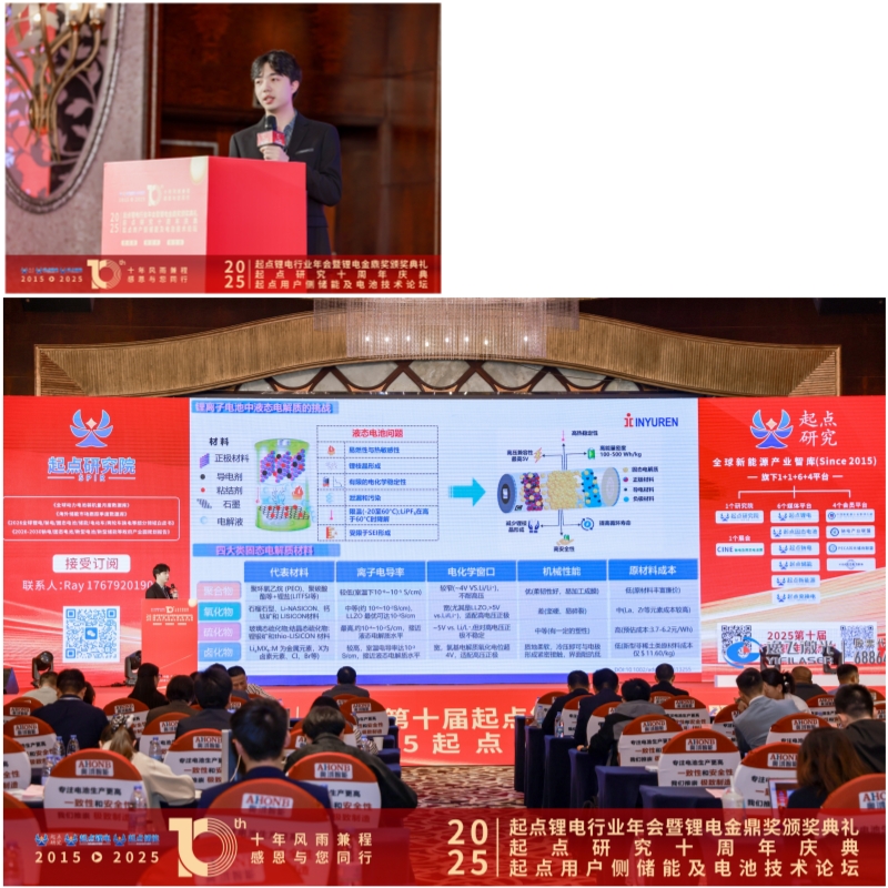 2025年12月18-19日,以“新周期、新技术、新生态”为主题的“2025(第十届)起点锂电行业年会暨锂电金鼎奖颁奖典礼&起点研究十周年庆典、2025起点用户侧储能及电池技术论坛”在深圳举行,信宇人与会代表——信宇人应用技术研究院谢尚辰做了《卤化物固态电解质的技术进展》主题演讲和参与圆桌对话。同期,信宇人收获了由大会颁发的“2025年度锂电行业客户信赖品牌”奖项。